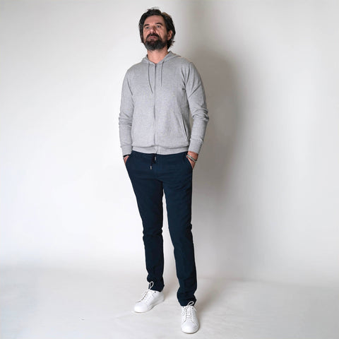 Le Pantalon à Lacet “Stoke Park” Bleu. Modèle de Pantalon avec Cordon de Serrage à la Taille avec la possibilité de le porter extérieurement pour un côté Sport-Chic ou de le caché pour être plus classique. 100% Coton épais et Chaud. Made in Portugal.