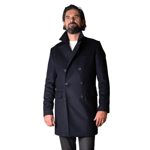 Caban “Oberkampf” Croisé Bleu Marine en drap de laine 3/4 et ces deux Poches en Biais et une fente dans le dos. 75% Laine , 25% Polyamide.